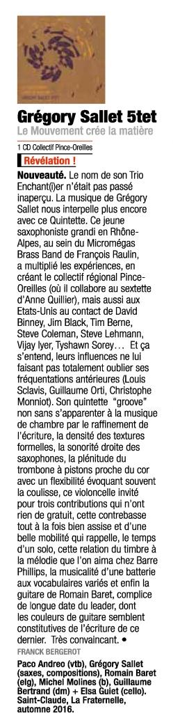 "Le nom de son Trio Enchant(i)er n'était pas passé inaperçu. La musique de Gregory SALLET nous interpelle plus encore avec ce quintette(...).